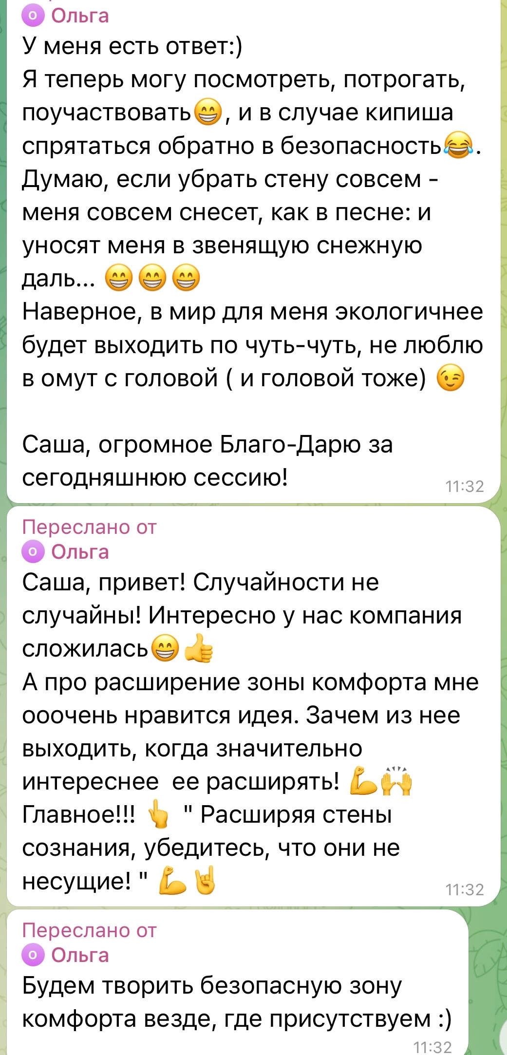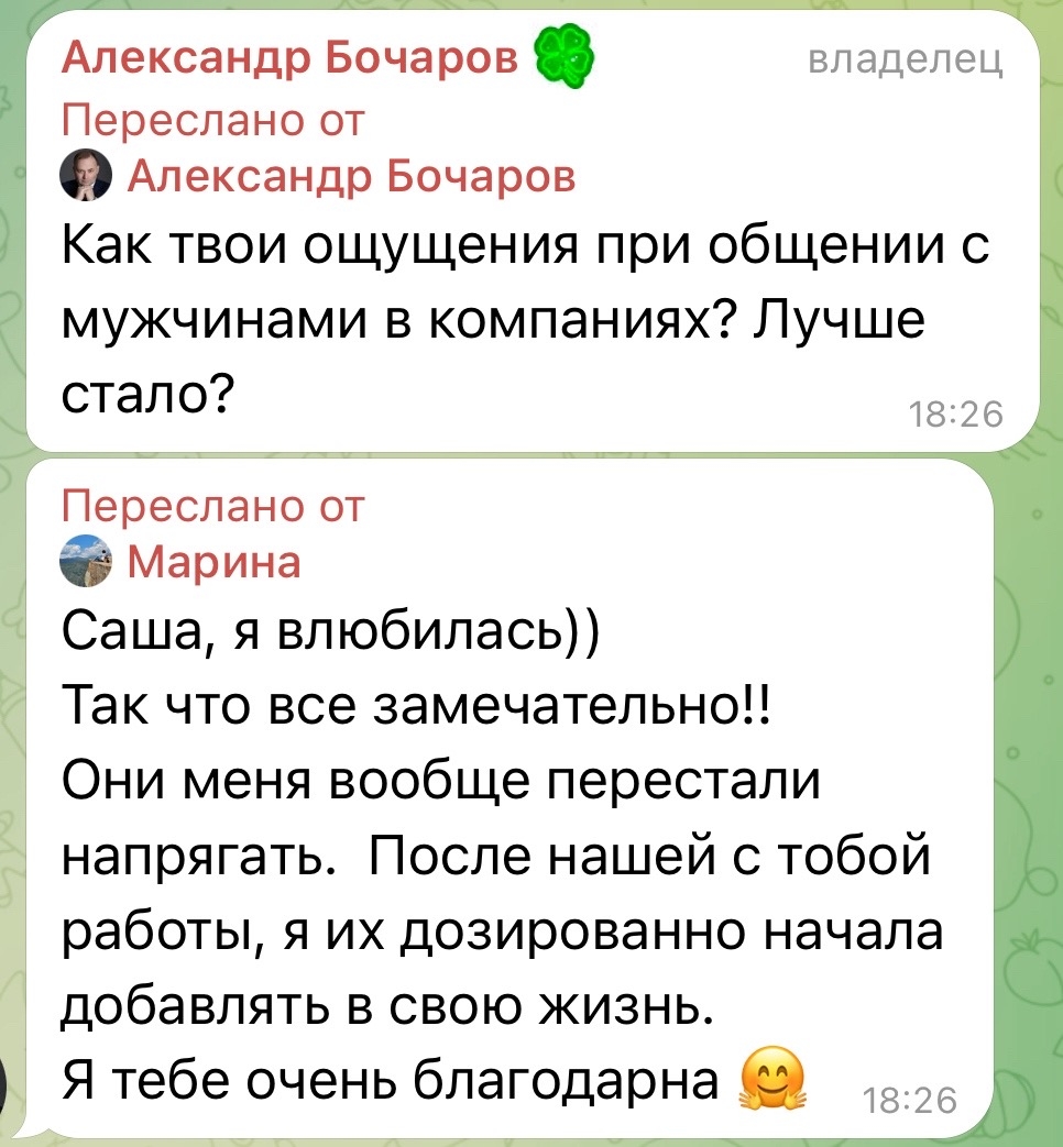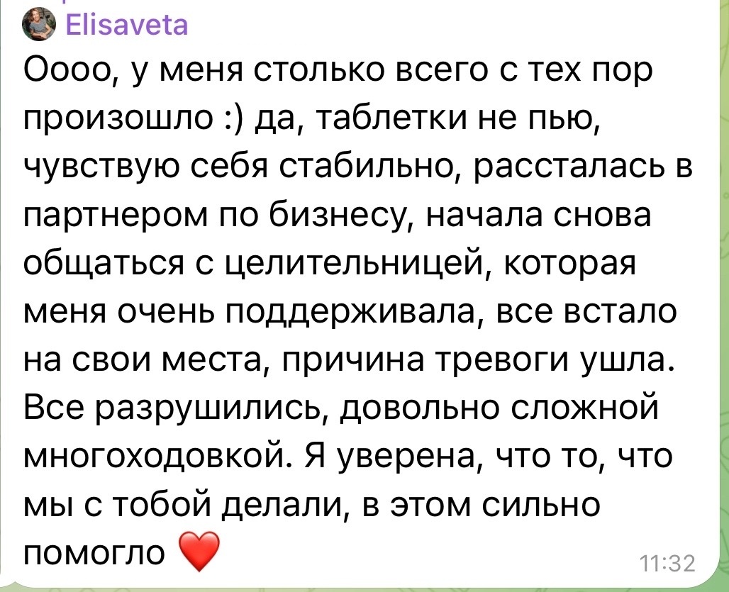 Результат меня, признаюсь, тоже впечатлил. Уже через пару дней она написала, что взяла первых трех клиентов. И что самое ценное — эти клиенты остались с ней и продолжают ходить на терапию.