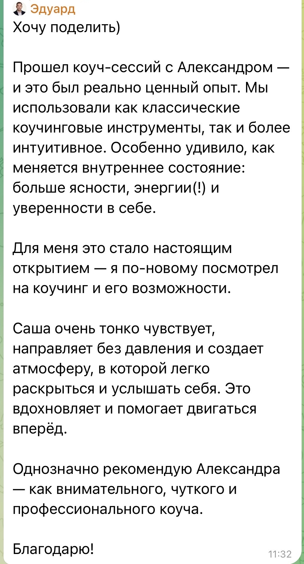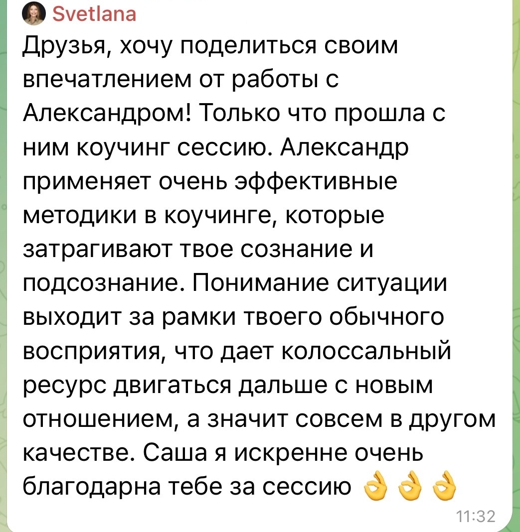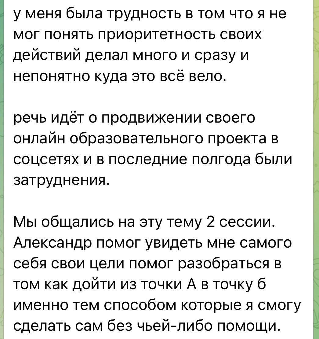 Он так отозвался о нашей работе: «Александр помог увидеть мне самого себя и свои цели, разобраться в том, как дойти из точки А в точку Б именно тем способом, который я смогу сделать сам».