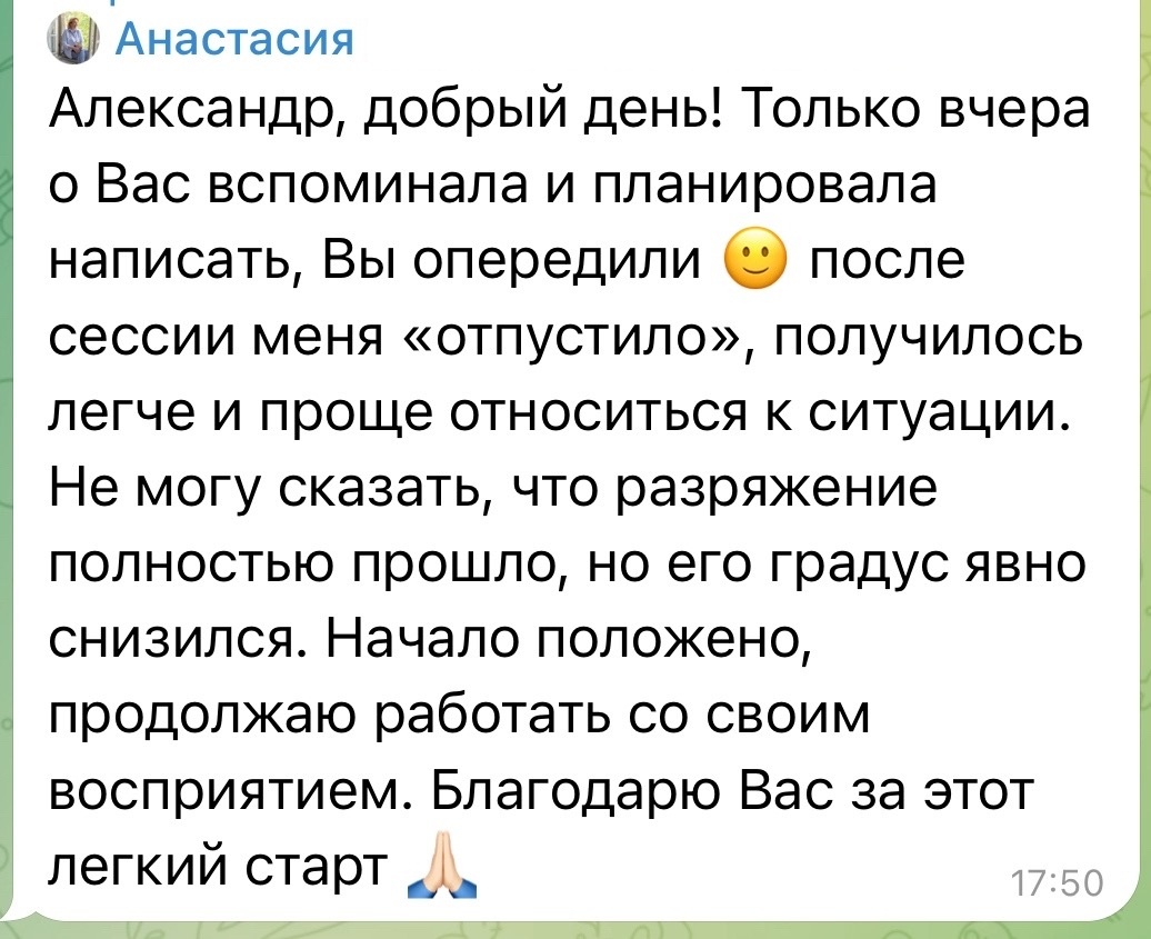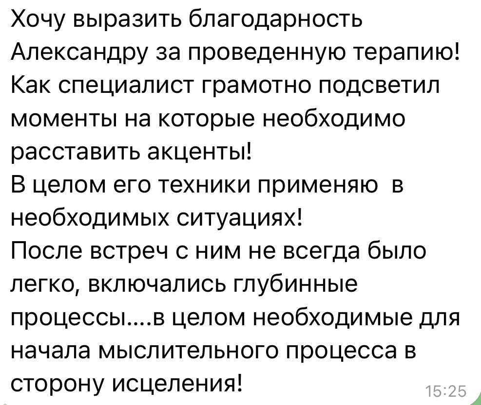 Вот что она написала потом: «Александр, благодарю тебя за то, что ты за 15-20 минут убрал мой страх вождения... Удивительно, но спустя всего лишь пару дней после консультаций, я замечала, как мне становилось ровно и комфортно... Очень приятно, что не приходится тратить много времени на проработки».